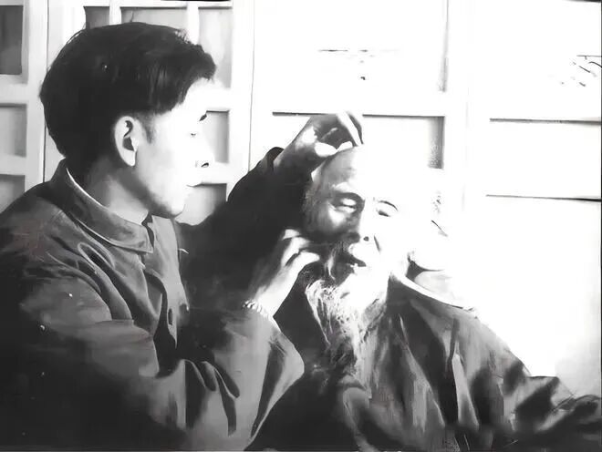 齐良迟先生(左)在创作,右为本文作者,摄于1993年