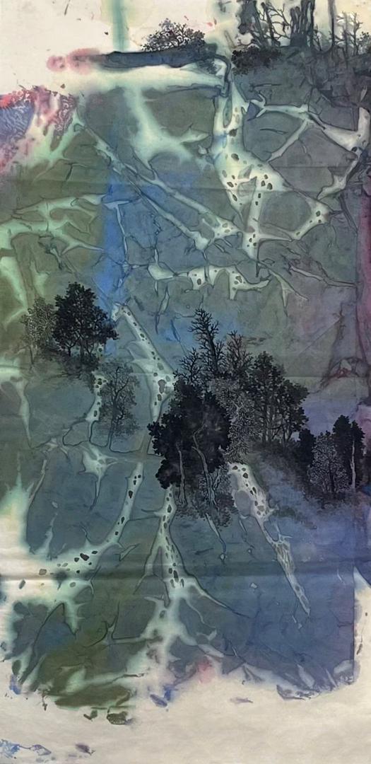 董春莲的泼彩艺术始于上世纪70年代与丈夫孙礼仁的共同研究与摸索。其创作采用中国宣纸、墨等传统材料,并融合西方色彩与抽象理念,凭借当时的心情、兴致、天气、纸质等因素一气呵成,作品具有不可复制的独特性。