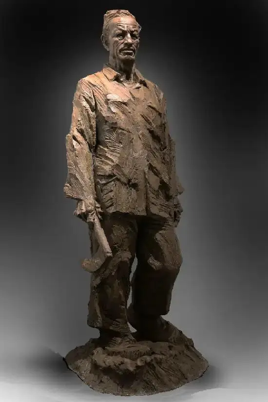李钢的雕塑作品,90%以上都是社会性的,在这些作品中我对《时代楷模文朝荣》这件情有独钟,这是贵州双百工程 的邀约作品,是在贵州邀约作品里最好的一件,我觉得这件 作品,应该是李钢艺术才华的集大成之作,是对脱贫攻坚人 物很深的挖掘和精准的把握,是对文朝荣质朴坚毅、无私精 神特质的完美塑造,这件作品被贵州美术馆收藏并陈列。