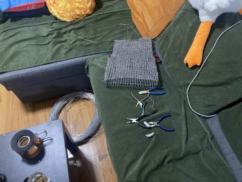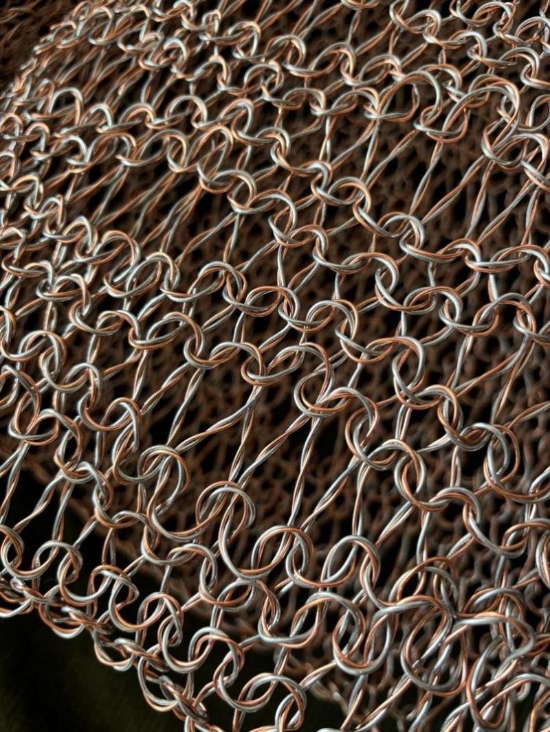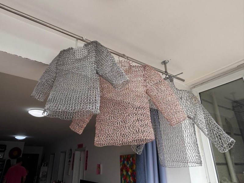 在当代艺术的语境中,“形式即内容”并非虚指,材料的选择即是观念的初次命名。白晶之所以弃绝柔软而选择铝丝,本质上是对“物性”逻辑的深层挖掘。铝丝作为一种工业化、非生命、甚至带有某种防御性质的硬性介质,与“织毛衣”这一带有强烈温度感的身体行为构成了本质上的互斥。编织,在这里不再是悠闲的家事,而演变为一场艺术家与冷硬物质之间的仪式性角力。每一处针脚的扭转、每一道铝丝的穿刺,都对应着身体的直接损耗,这种技法本身便具备了劳作的仪式感,模拟了女性在漫长岁月中承受的无声磨损。从语言学角度看,铝丝是语义的“反转”:它让原本提供保护的衣物变质为一副锁子甲,或是一座中空的牢笼。观众在视觉与潜在触觉的交织中,完成了一次心理介入:当你试图触摸温暖,你得到的却是刺痛。这种感官叙事精准地揭示了情感劳动的本质属性——它是以柔克刚的损耗,是女性作为“容器”在承载世界痛苦时,不得不将自身意志异化为金属般坚韧的防御机制。