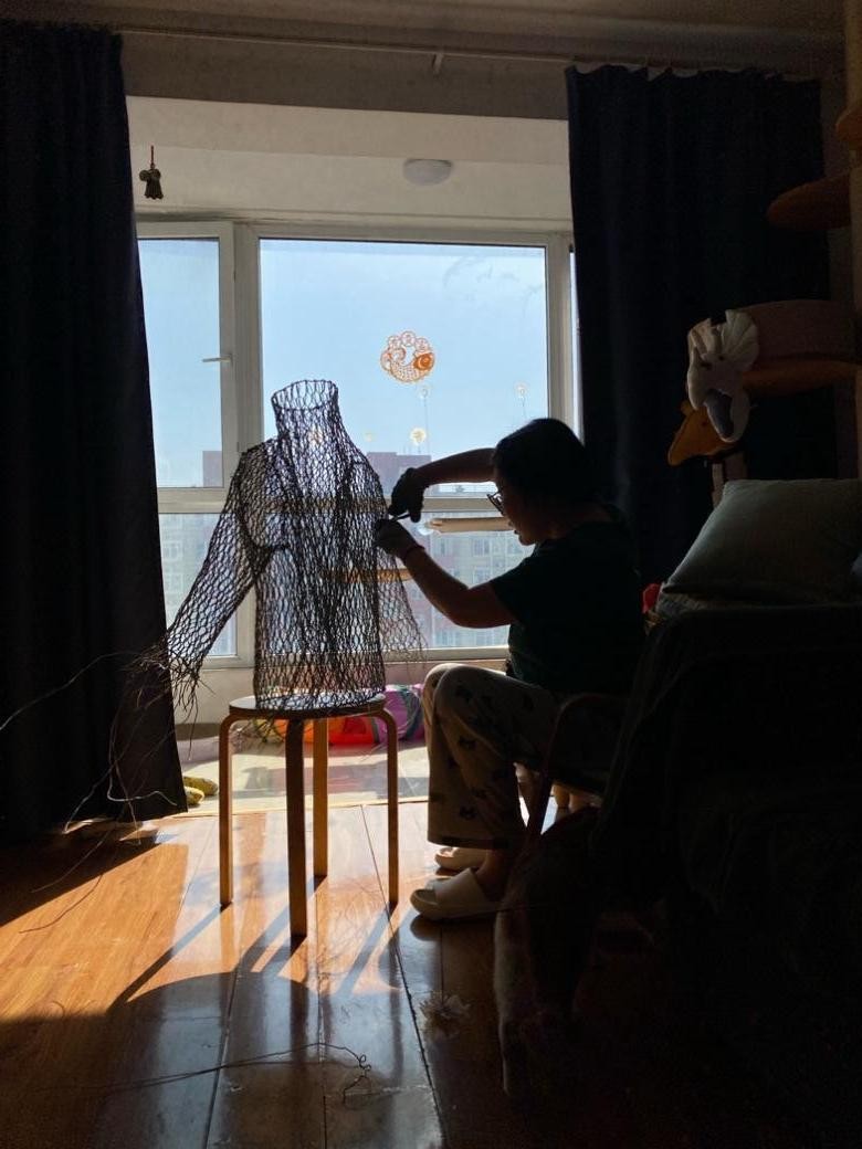 考察白晶的艺术轨迹,可以发现一条清晰的“去媒介化”逻辑。从早期参与影视编剧的线性叙事,到肢体剧场中追求“身体在场”的瞬时行为,再到当下装置艺术中“物质遗骸”的凝固,媒介的更迭并非形式的堆砌,而是为了追求表达的绝对纯度。在戏剧语境下,“织毛衣”是一个动词,它依赖表演者的消耗与时间的流逝;而在装置语境下,它坍缩为一个名词,一个结果。白晶敏锐地意识到,剧场中的动作是转瞬即逝的,而母职与规训对女性的刻写却是恒久的。因此,她选择剥离掉戏剧中多余的情绪渲染与对白,剥离掉影视中繁复的因果链条,最终抵达了这一物质内核。当动作停止,剩下的这些由铝丝编织成的、空洞的人形壳体,便成了劳动的最终“物证”,其中不仅是对过往创作的升华,更是一种逻辑上的必然,为了让那份看不见的损耗被看见,艺术家必须制造一个能够抵御时间腐蚀的“劳骸”。